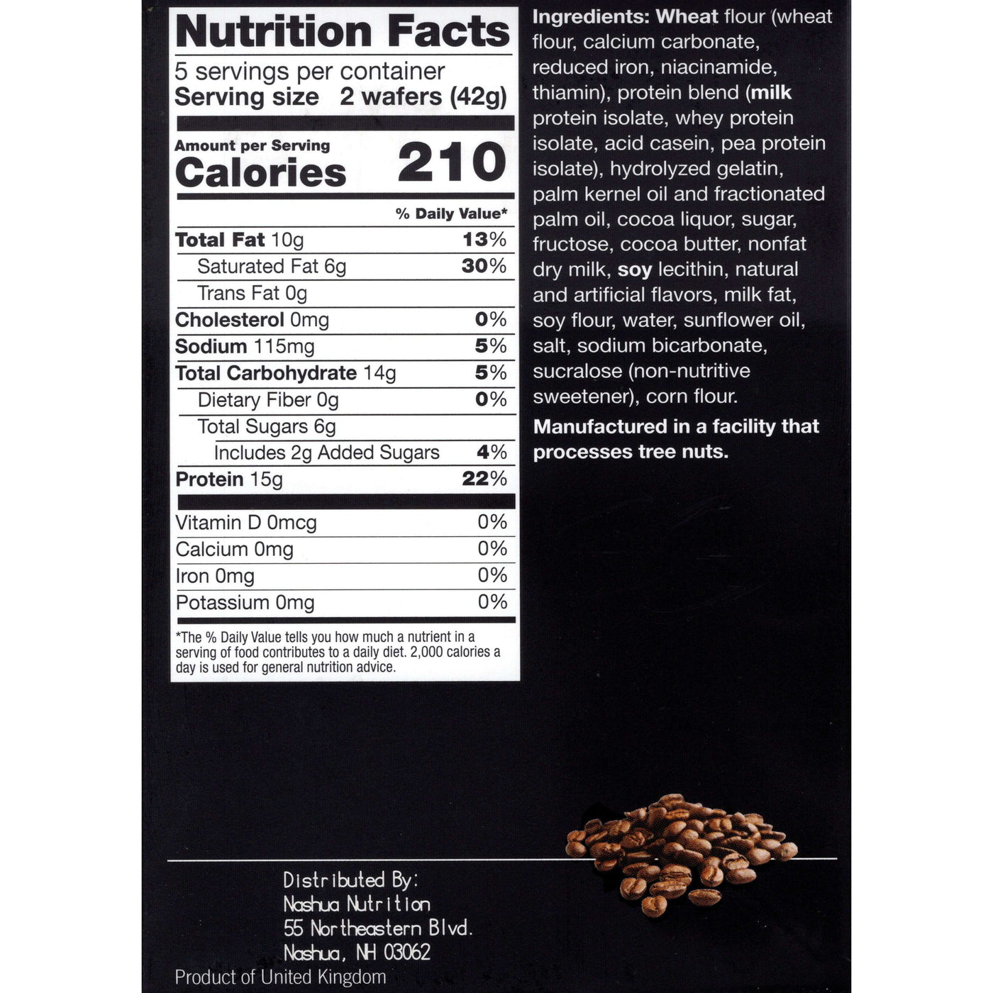 Wheat flour (wheat flour, calcium carbonate, reduced iron, niacinamide, thiamin), protein blend (milk protein isolate, whey protein isolate, acid casein, pea protein isolate), hydrolyzed gelatin, palm kernel oil and fractionated palm oil, , cocoa liquor, sugar, fructose, cocoa butter, nonfat dry milk, soy lecithin, natural and artificial flavors, milk fat, soy flour, water, sunflower oil, salt, sodium bicarbonate, sucralose (non-nutritive sweetener), corn flour. Manufactured in a facility that processes tree nuts. |
