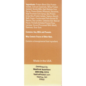 Protein Blend (Soy Protein Isolate, Calcium Caseinate, Whey Protein Isolate), Nonfat Milk, High Maltose Corn Syrup, Peanut Butter (Peanuts), Glycerine, High Fructose Corn Syrup, Soy Protein Crisp (Soy Protein Isolate, Tapioca Starch, Salt), Sugar, Fractionated Palm Kernel Oil, Raisins, Soy Lecithin, Cellulose Gel, Natural Flavor, Partially Defatted Peanut Flour, Lactose, Cocoa (Processed With Alkali), Dextrose, Guar Gum.