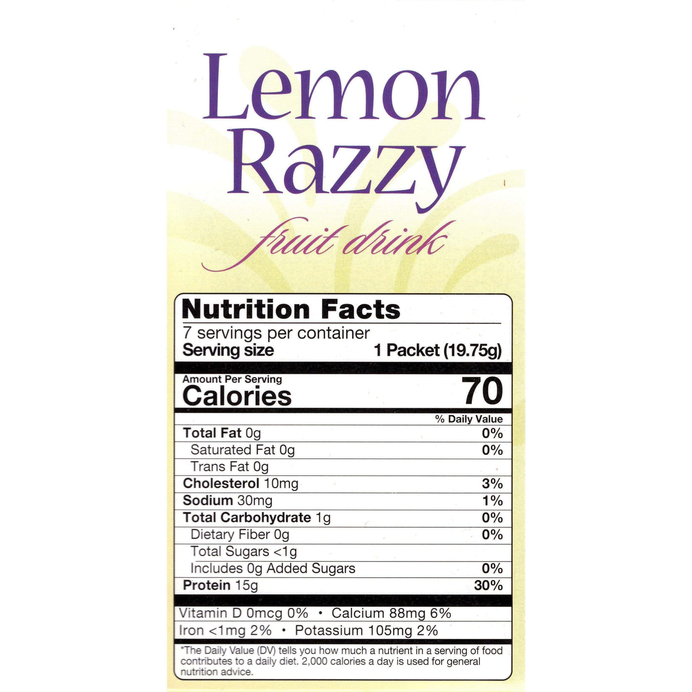 A delicious, refreshing combination of lemon and raspberries, the HealthSmart Lemon Razzy Drink provides a high protein, fat-free, low calorie and low carb option that allows you to enjoy a tasty beverage without any guilt!