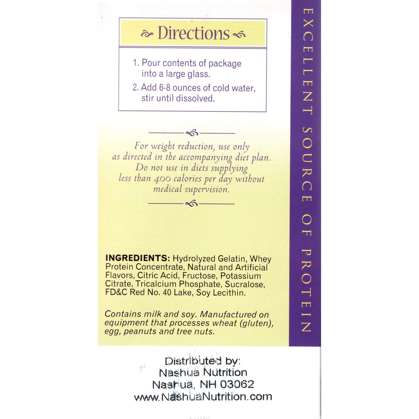Hydrolyzed Gelatin, Whey Protein Concentrate, Natural and Artificial Flavors, Citric Acid, Fructose, Potassium Citrate, Tricalcium Phosphate, Sucralose, FD&C Red #40 Lake, Soy Lecithin.