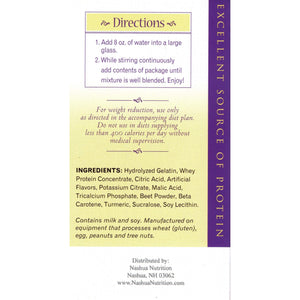Hydrolyzed Gelatin, Whey Protein, Citric Acid, Artificial Flavors, Potassium Citrate, Malic Acid, Tricalcium Phosphate, Beet Powder, Beta Carotene, Turmeric, Sucralose, Soy Lecithin. Manufactured on equipment that processes wheat (gluten), egg, peanuts and tree nuts. |