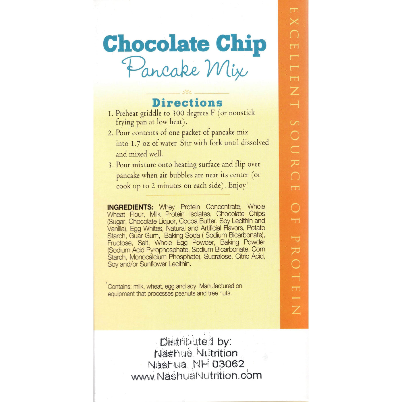 Whey Protein Concentrate, Whole Wheat Flour, Milk Protein Isolates, Chocolate Chips (Sugar, Chocolate Liquor, Cocoa Butter, Soy Lecithin and Vanilla), Egg Whites, Natural & Artificial Flavors, Potato Starch, Guar Gum, Baking Soda (Sodium Bicarbonate), Fructose, Salt, Whole Egg Powder, Baking Powder (Sodium Acid Pyrophosphate, Sodium Bicarbonate, Corn Starch, Monocalcium Phosphate), Sucralose, Citric Acid, Soy and/or Sunflower Lecithin. Contains Milk, Wheat, Egg and Soy. Manufactured on equipment that processes Peanuts and Tree Nuts. |