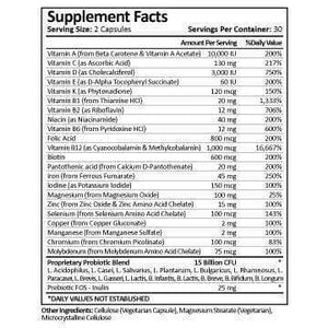Includes 5 Probiotic strains plus our complete multivitamin. See supplemental facts for complete ingredients.