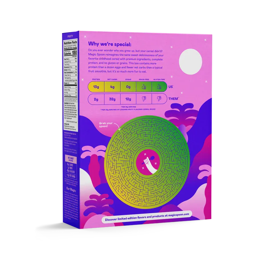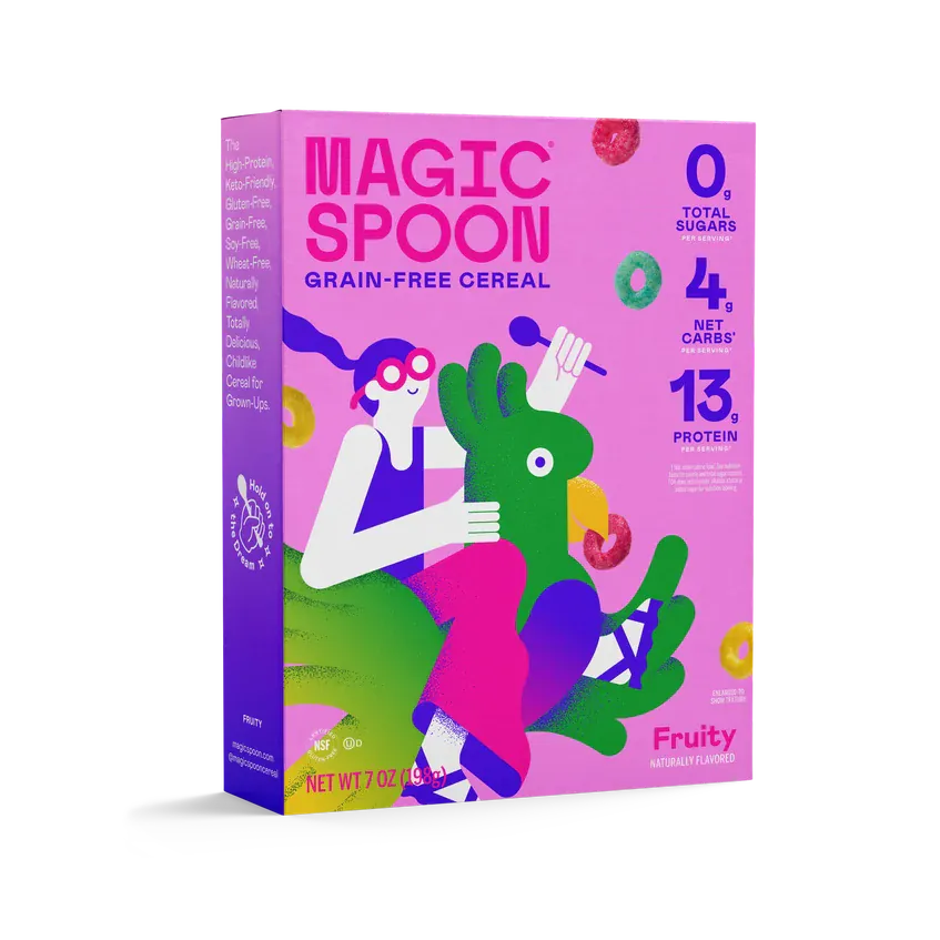 A fruity cereal that isn’t loopy. Magic Spoon Fruity is a grain-free cereal with a classic fruit-forward crunch, made for grown-ups who still want that fun bowl. Why you’ll like it Fruity, naturally flavored cereal 0 g total sugars per serving 4 g net carbs per serving 13 g protein per serving Grain free and gluten free Keto friendly Soy free and wheat free What’s...