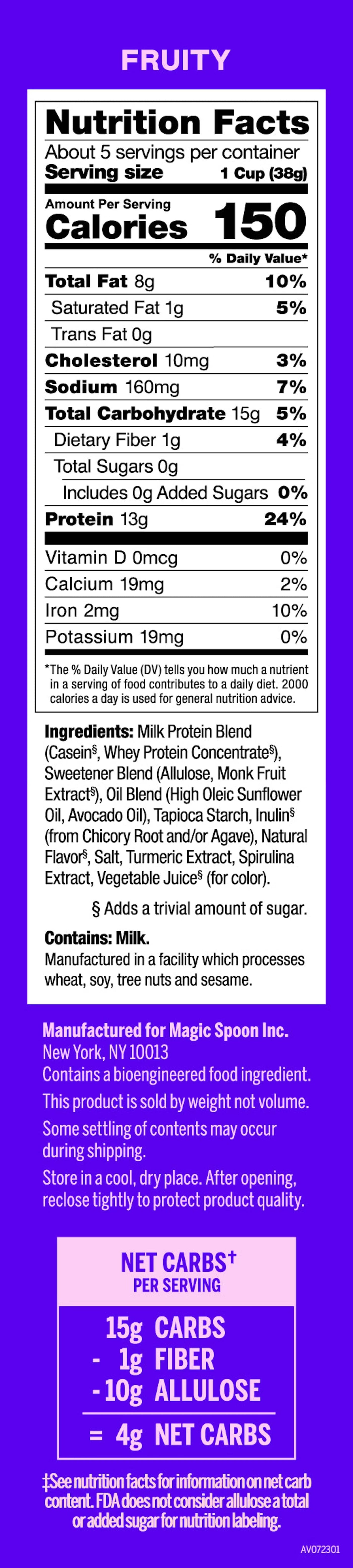 {"id":7545421430866,"title":"Magic Spoon High Protein Cereal | Fruity | 1 Box of 5 Servings","handle":"magic-spoon-high-protein-cereal-fruity-8-box","description":"\u003c!-- Product Description: Overview --\u003e\n\u003cp\u003e\n A fruity cereal that isn’t loopy. Magic Spoon Fruity is a grain-free cereal with a classic fruit-forward crunch, made for grown-ups who still want that fun bowl.\n\u003c\/p\u003e\n\n\u003c!-- Product Description: Why you'll like it --\u003e\n\u003ch2\u003eWhy you’ll like it\u003c\/h2\u003e\n\u003cul\u003e\n \u003cli\u003eFruity, naturally flavored cereal\u003c\/li\u003e\n \u003cli\u003e0 g total sugars per serving\u003c\/li\u003e\n \u003cli\u003e4 g net carbs per serving\u003c\/li\u003e\n \u003cli\u003e13 g protein per serving\u003c\/li\u003e\n \u003cli\u003eGrain free and gluten free\u003c\/li\u003e\n \u003cli\u003eKeto friendly\u003c\/li\u003e\n \u003cli\u003eSoy free and wheat free\u003c\/li\u003e\n\u003c\/ul\u003e\n\n\u003c!-- Product Description: What’s included --\u003e\n\u003ch2\u003eWhat’s included\u003c\/h2\u003e\n\u003cul\u003e\n \u003cli\u003e1 box of Magic Spoon Grain-Free Cereal (Fruity), net wt 7 oz (198 g)\u003c\/li\u003e\n\u003c\/ul\u003e\n\n\u003c!-- ===================== START: Nutrition Facts (Magic Spoon Fruity Cereal — single serving only) ===================== --\u003e\n\u003cdiv style=\"color: black; background: white;\"\u003e\n\n\u003c!-- ===== START: Responsive CSS (Shopify-safe; no font-family) ===== --\u003e\n\u003cstyle\u003e\n @media (max-width:480px){\n table.nf-table{max-width:300px !important; font-size:13px !important}\n .nf-title{font-size:24px !important}\n .nf-cal{font-size:24px !important}\n .nf-note{font-size:11px !important}\n }\n @media (min-width:481px){\n table.nf-table{max-width:450px !important; font-size:15px !important}\n .nf-title{font-size:28px !important}\n .nf-cal{font-size:26px !important}\n .nf-note{font-size:12px !important}\n }\n\u003c\/style\u003e\n\u003c!-- ===== END: Responsive CSS ===== --\u003e\n\n\u003c!-- ===== START: Title ===== --\u003e\n\u003ch2 style=\"margin: 0 0 6px; font-weight: bold;\" class=\"nf-title\"\u003eNutrition Facts\u003c\/h2\u003e\n\u003c!-- ===== END: Title ===== --\u003e\n\n\u003c!-- ===== START: Nutrition Table ===== --\u003e\n\u003ctable style=\"width: 100%; border: 2px solid black; border-collapse: collapse; background: white;\" border=\"0\" cellspacing=\"0\" cellpadding=\"0\" aria-label=\"Nutrition facts for 1 cup (38 grams)\" role=\"table\" class=\"nf-table\"\u003e\n \u003ccaption style=\"display:none;\"\u003e\n Nutrition facts table for a single serving (1 cup, 38g)\n \u003c\/caption\u003e\n\n \u003cthead\u003e\n \u003ctr\u003e\n \u003cth style=\"text-align:left; padding:6px; border:1px solid black;\" scope=\"col\" colspan=\"2\"\u003e\n Serving size 1 cup (38g)\n \u003c\/th\u003e\n \u003c\/tr\u003e\n\n \u003ctr\u003e\n \u003cth style=\"text-align:left; padding:8px; border-top:2px solid black; border-bottom:4px solid black;\" class=\"nf-cal\" scope=\"col\" colspan=\"2\"\u003e\n Calories 150\n \u003c\/th\u003e\n \u003c\/tr\u003e\n\n \u003ctr\u003e\n \u003cth style=\"text-align:left; padding:6px; border:1px solid black;\" scope=\"col\"\u003e\n Amount per serving\n \u003c\/th\u003e\n \u003cth style=\"text-align:right; padding:6px; border:1px solid black;\" scope=\"col\"\u003e\n % daily value*\n \u003c\/th\u003e\n \u003c\/tr\u003e\n \u003c\/thead\u003e\n\n \u003ctbody\u003e\n\n \u003ctr\u003e\n \u003cth scope=\"row\" style=\"text-align:left; padding:6px; border:1px solid black;\"\u003e\n Total fat 8g\n \u003c\/th\u003e\n \u003ctd style=\"text-align:right; padding:6px; border:1px solid black;\"\u003e\n 10%\n \u003c\/td\u003e\n \u003c\/tr\u003e\n\n \u003ctr\u003e\n \u003cth scope=\"row\" style=\"text-align:left; padding:6px 6px 6px 18px; border:1px solid black;\"\u003e\n Saturated fat 1g\n \u003c\/th\u003e\n \u003ctd style=\"text-align:right; padding:6px; border:1px solid black;\"\u003e\n 5%\n \u003c\/td\u003e\n \u003c\/tr\u003e\n\n \u003ctr\u003e\n \u003cth scope=\"row\" style=\"text-align:left; padding:6px 6px 6px 18px; border:1px solid black;\"\u003e\n Trans fat 0g\n \u003c\/th\u003e\n \u003ctd style=\"text-align:right; padding:6px; border:1px solid black;\"\u003e\u003c\/td\u003e\n \u003c\/tr\u003e\n\n \u003ctr\u003e\n \u003cth scope=\"row\" style=\"text-align:left; padding:6px; border:1px solid black;\"\u003e\n Cholesterol 10mg\n \u003c\/th\u003e\n \u003ctd style=\"text-align:right; padding:6px; border:1px solid black;\"\u003e\n 3%\n \u003c\/td\u003e\n \u003c\/tr\u003e\n\n \u003ctr\u003e\n \u003cth scope=\"row\" style=\"text-align:left; padding:6px; border:1px solid black;\"\u003e\n Sodium 160mg\n \u003c\/th\u003e\n \u003ctd style=\"text-align:right; padding:6px; border:1px solid black;\"\u003e\n 7%\n \u003c\/td\u003e\n \u003c\/tr\u003e\n\n \u003ctr\u003e\n \u003cth scope=\"row\" style=\"text-align:left; padding:6px; border:1px solid black;\"\u003e\n Total carbohydrate 15g\n \u003c\/th\u003e\n \u003ctd style=\"text-align:right; padding:6px; border:1px solid black;\"\u003e\n 5%\n \u003c\/td\u003e\n \u003c\/tr\u003e\n\n \u003ctr\u003e\n \u003cth scope=\"row\" style=\"text-align:left; padding:6px 6px 6px 18px; border:1px solid black;\"\u003e\n Dietary fiber 1g\n \u003c\/th\u003e\n \u003ctd style=\"text-align:right; padding:6px; border:1px solid black;\"\u003e\n 4%\n \u003c\/td\u003e\n \u003c\/tr\u003e\n\n \u003ctr\u003e\n \u003cth scope=\"row\" style=\"text-align:left; padding:6px 6px 6px 18px; border:1px solid black;\"\u003e\n Total sugars 0g\n \u003c\/th\u003e\n \u003ctd style=\"text-align:right; padding:6px; border:1px solid black;\"\u003e\u003c\/td\u003e\n \u003c\/tr\u003e\n\n \u003ctr\u003e\n \u003cth scope=\"row\" style=\"text-align:left; padding:6px 6px 6px 32px; border:1px solid black;\"\u003e\n Includes 0g added sugars\n \u003c\/th\u003e\n \u003ctd style=\"text-align:right; padding:6px; border:1px solid black;\"\u003e\n 0%\n \u003c\/td\u003e\n \u003c\/tr\u003e\n\n