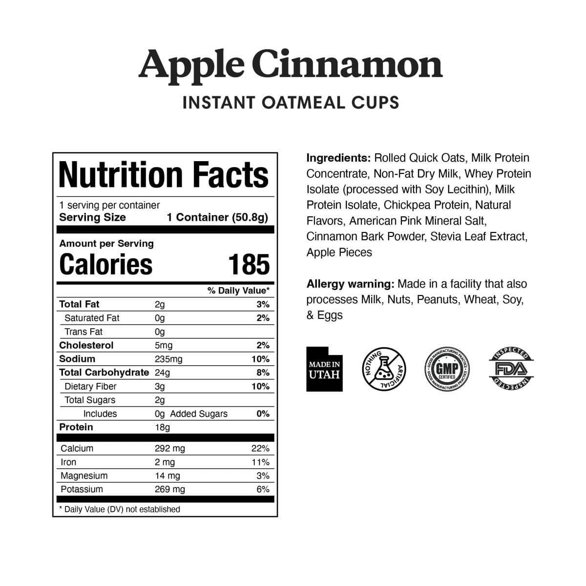 Rolled quick oats, milk protein concentrate, non-fat dry milk, whey protein isolate (processed with soy lecithin), milk protein isolate, chickpea protein, natural flavors, American pink mineral salt, cinnamon bark powder, stevia leaf extract, apple pieces.