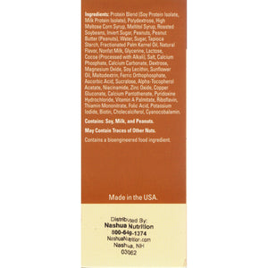 Protein Blend (Soy Protein Isolate, Milk Protein Isolate) Polydextrose, High Maltose Corn Syrup, Maltitol Syrup, Roasted Soybeans, Invert Sugar, Peanuts, Peanut Butter (Peanuts), Water, Sugar, Tapioca Starch, Fractionated Palm Kernel Oil, Natural Flavor, Nonfat Milk, Glycerine, Lactose, Cocoa (Processed with Alkali), Salt, Calcium Phosphate, Calcium Carbonate, Dextrose, Magnesium Oxide, Soy Lecithin, Sunflower Oil, Maltodextrin, Ferric Orthophosphate, Ascorbic Acid, Sucralose, Alpha-Tocopherol Acetate, Niacinamide, Zinc Oxide, Copper Gluconate, Calcium Pantothenate, Pyridoxine Hydrochloride, Vitamin A Palmitate, Riboflavin, Thiamin Mononitrate, Folic Acid, Potassium Iodide, Biotin, Cholecalciferol, Cyanocobalamin). Contains: Soy, Milk, and Peanuts. MAY CONTAIN TRACES OF OTHER NUTS. |