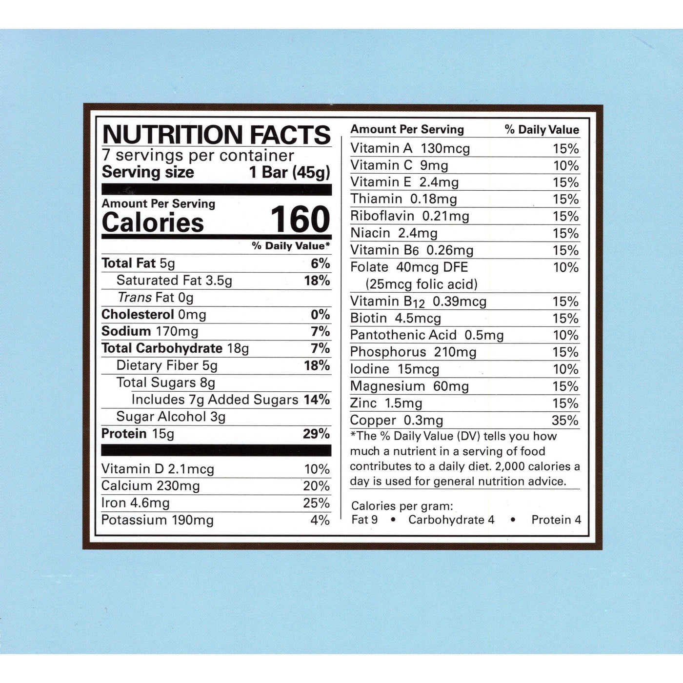 | Serving Size: 1 Bar (45g) | Servings Per Container: 7 | ||