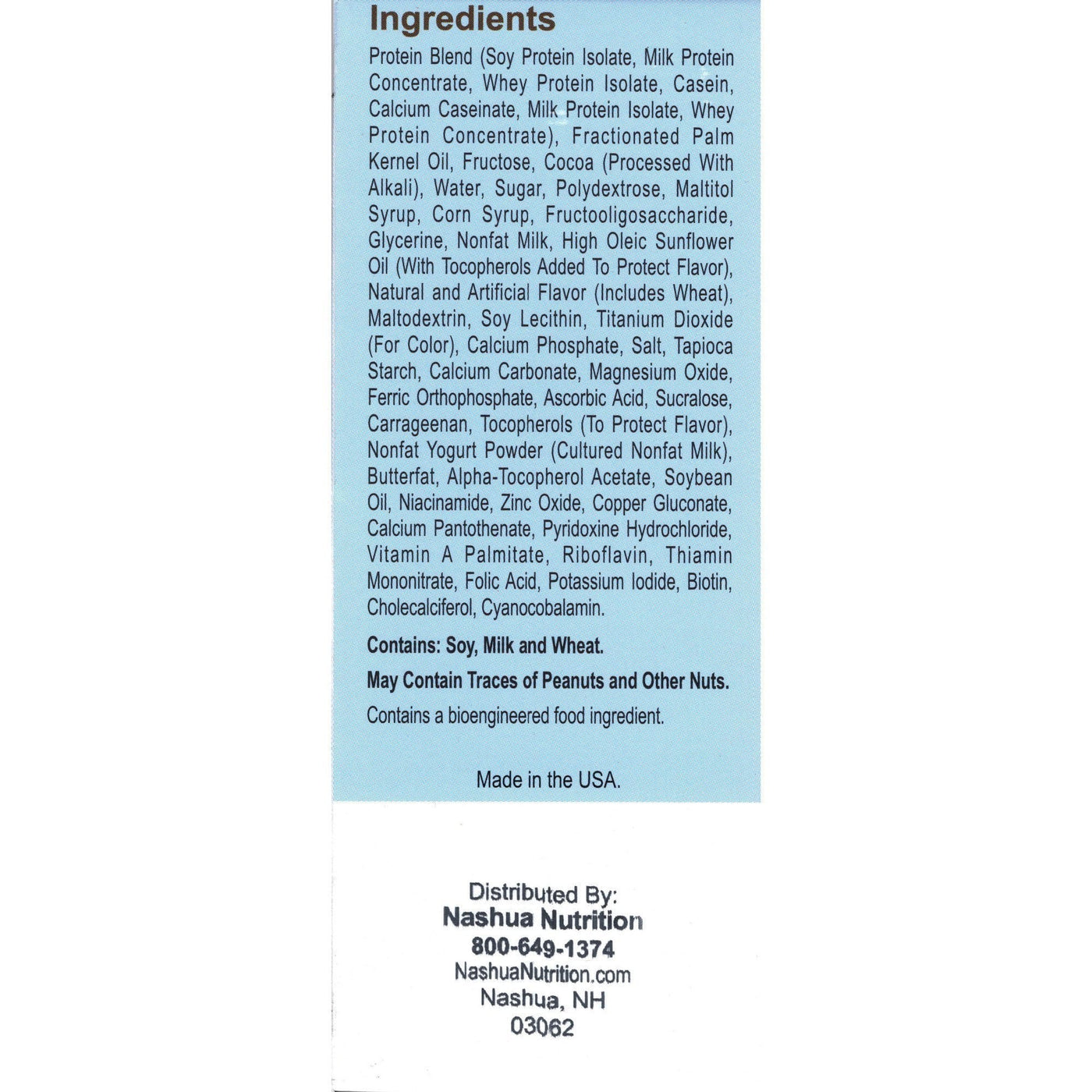 Protein Blend (Soy Protein Isolate, Whey Protein Concentrate, Calcium Caseinate, Whey Protein Isolate, Casein, Milk Protein Isolate, Whey), Sugar, Fractionated Palm Kernel and Palm Oil, Cream, Polydextrose, Corn Syrup, Maltitol Syrup, Fructose, Cocoa (Processed With Alkali), Water, Fructooligosaccharide, Nonfat Milk, Milk, Soy Lecithin, Glycerine, Calcium Phosphate, Tapioca Starch, Natural Flavor, Salt, Calcium Carbonate, High Oleic Sunflower Oil (With Tocopherols Added To Protect Flavor), Magnesium Oxide, Butterfat, Maltodextrin, Ferric Orthophosphate, Ascorbic Acid, Sucralose, Alpha-Tocopherol Acetate, Niacinamide, Zinc Oxide, Paprika Extract (For Color), Copper Gluconate, Calcium Pantothenate, Pyridoxine Hydrochloride, Vitamin A Palmitate, Riboflavin, Thiamin Mononitrate, Annatto Extract (For Color), Folic Acid, Potassium Iodide, Biotin, Cholecalciferol, Cyanocobalamin. Contains: Soy and Milk May contain traces of peanuts and other nuts. |