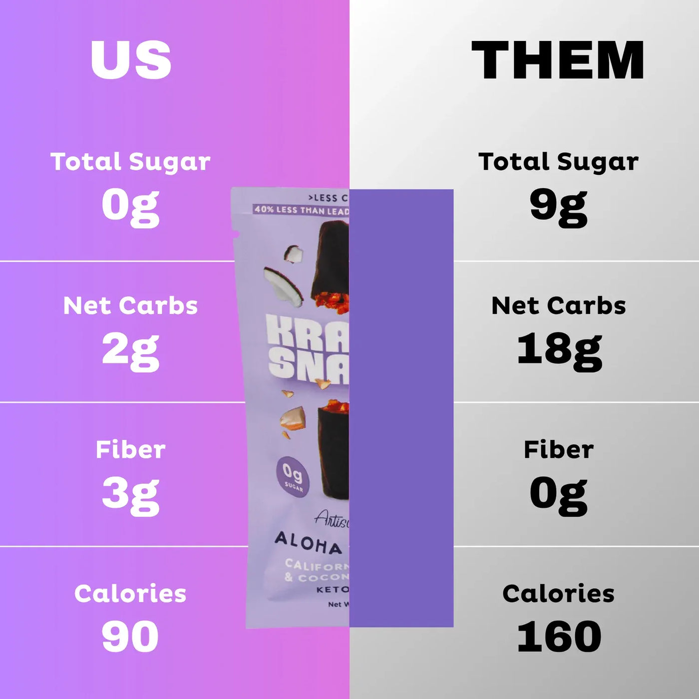 CRAVE-WORTHY candy with clean ingredients and 0g sugar! Do you enjoy Samoa Girl Scout Cookies? What if I told you we elevated your favorite Girl Scout cookie it by turning it into a candy bar? That's what we did with our Aloha Caramel, which is a sugar-free coconut caramel with almonds, coated in a 75% Organic Ecuadorian Dark Chocolate. Chewy, nutty, and sweet caramel coated...