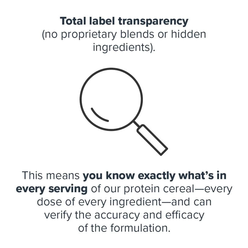 Naturally sweetened and flavored protein cereal made with premium milk protein concentrate and nutritious plant-based carbs, fats, and prebiotic fiber. 17 grams of protein per serving with 5.4 grams of essential amino acids 2.6 grams of BCAAs 7 grams of prebiotic fiber Naturally sweetened and flavored No soy, gluten, artificial sweeteners, flavors, food dyes, fillers, or other unnecessary junk Tested for purity and potency in...
