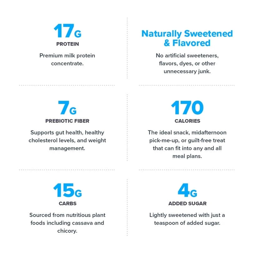 Naturally sweetened and flavored protein cereal made with premium milk protein concentrate and nutritious plant-based carbs, fats, and prebiotic fiber.