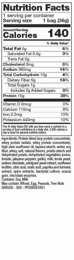 Protein blend (soy protein concentrate, whey protein isolate, whey protein concentrate), high oleic sunflower oil, tapioca starch, water, soy fiber, whey, salt, natural flavors, potato starch and dehydrated potato, dehydrated vegetables (onion, tomato, jalapeno peppers, garlic), milk, torula yeast, sodium diacetate, autolyzed yeast extract, sunflower lecithin, citric acid, malic acid, paprika and turmeric extract, spice extracts, beet powder, calcium sulfate, acacia gum, microbial enzymes.
