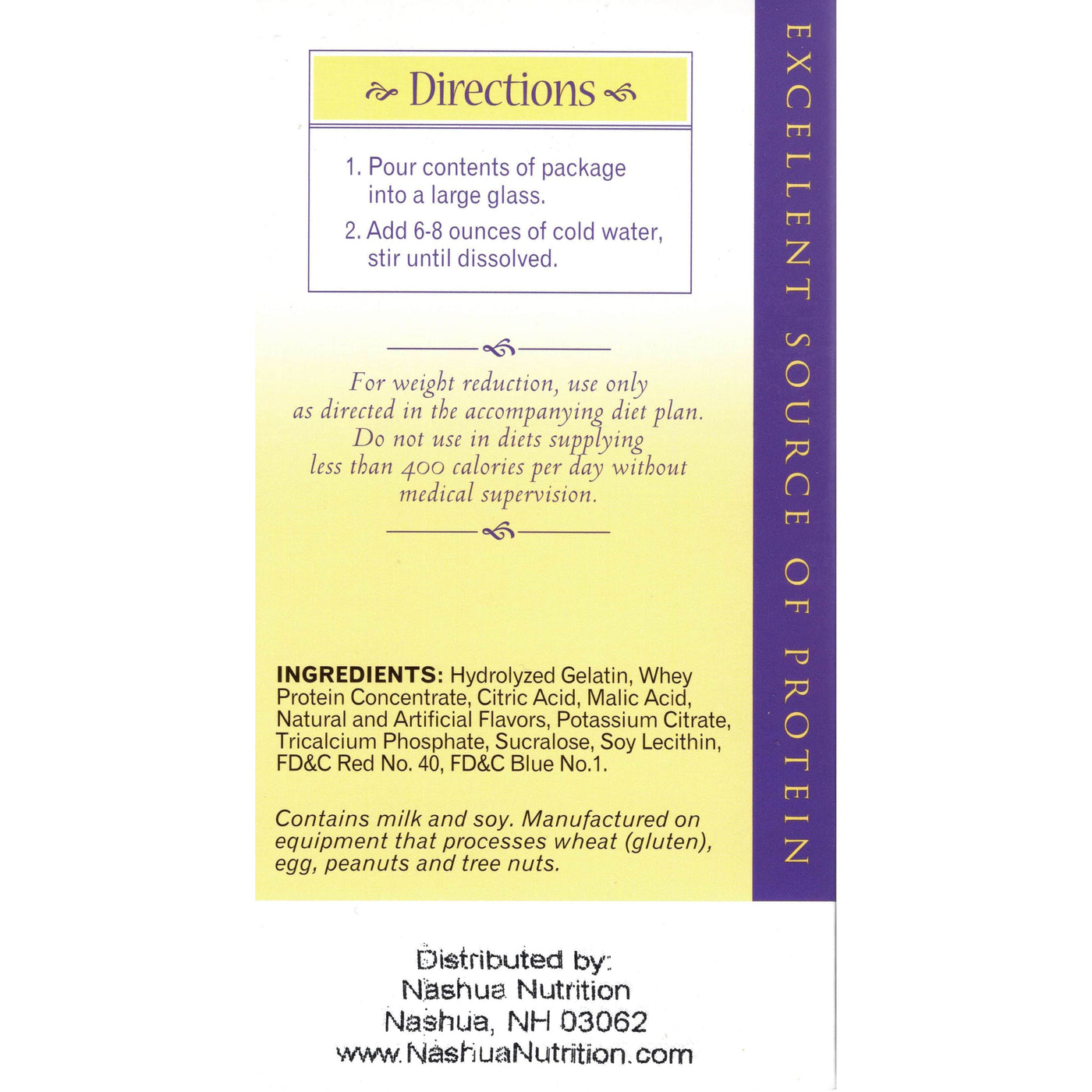 Hydrolyzed Gelatin, Whey Protein Concentrate, Citric Acid, Malic Acid, Natural and Artificial Flavors, Potassium Citrate, Tricalcium Phosphate, Sucralose, Soy Lecithin, FD&C Red #40, FD&C Blue #1.