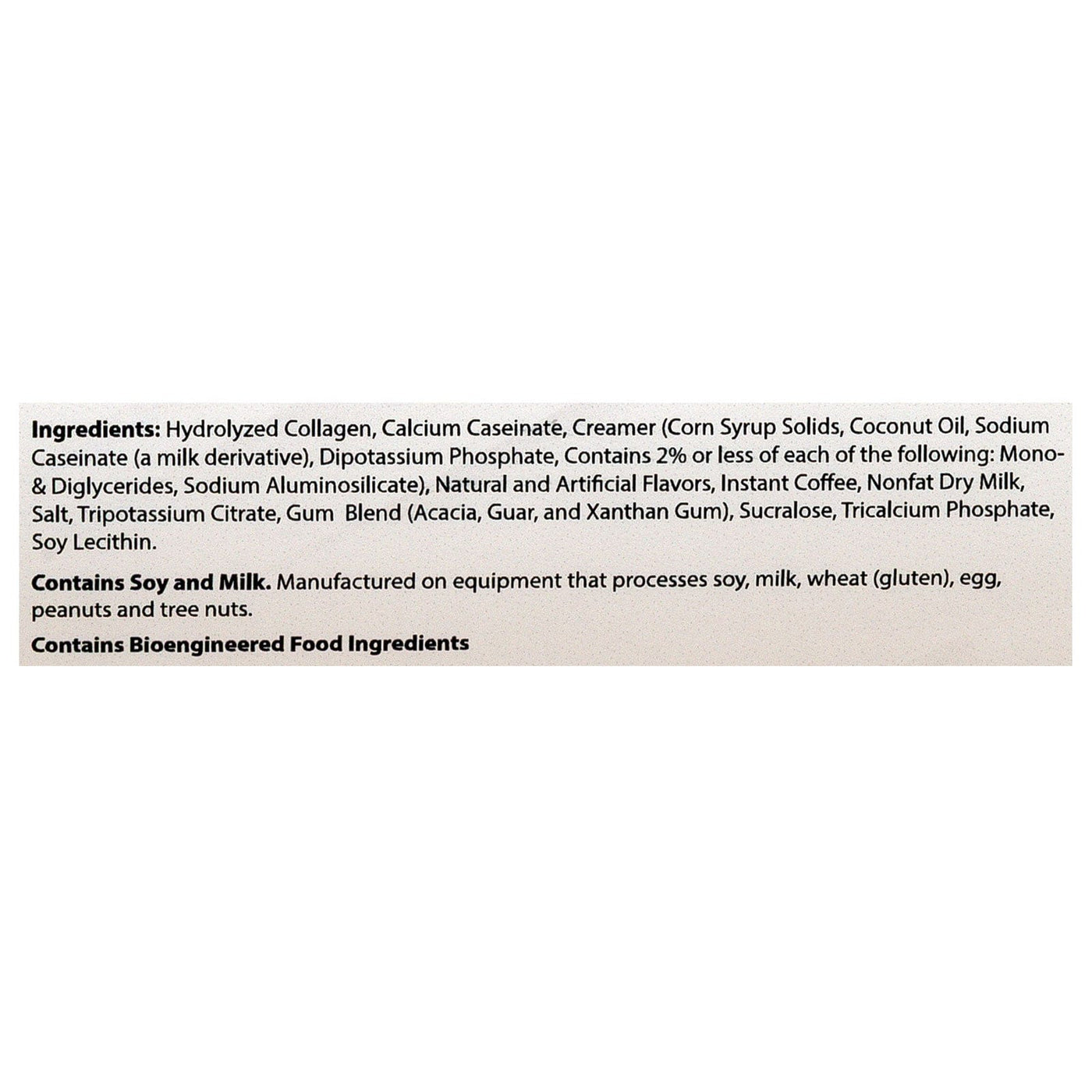 Hydrolyzed collagen, calcium caseinate, creamer (corn syrup solids, coconut oil, sodium caseinate [a milk derivative]), dipotassium phosphate, contains 2% or less of each of the following: mono- & diglycerides, sodium aluminosilicate, natural and artificial flavors, instant coffee, nonfat dry milk, salt, tripotassium citrate, gum blend (acacia, guar, and xanthan gum), sucralose, tricalcium phosphate, soy lecithin.
