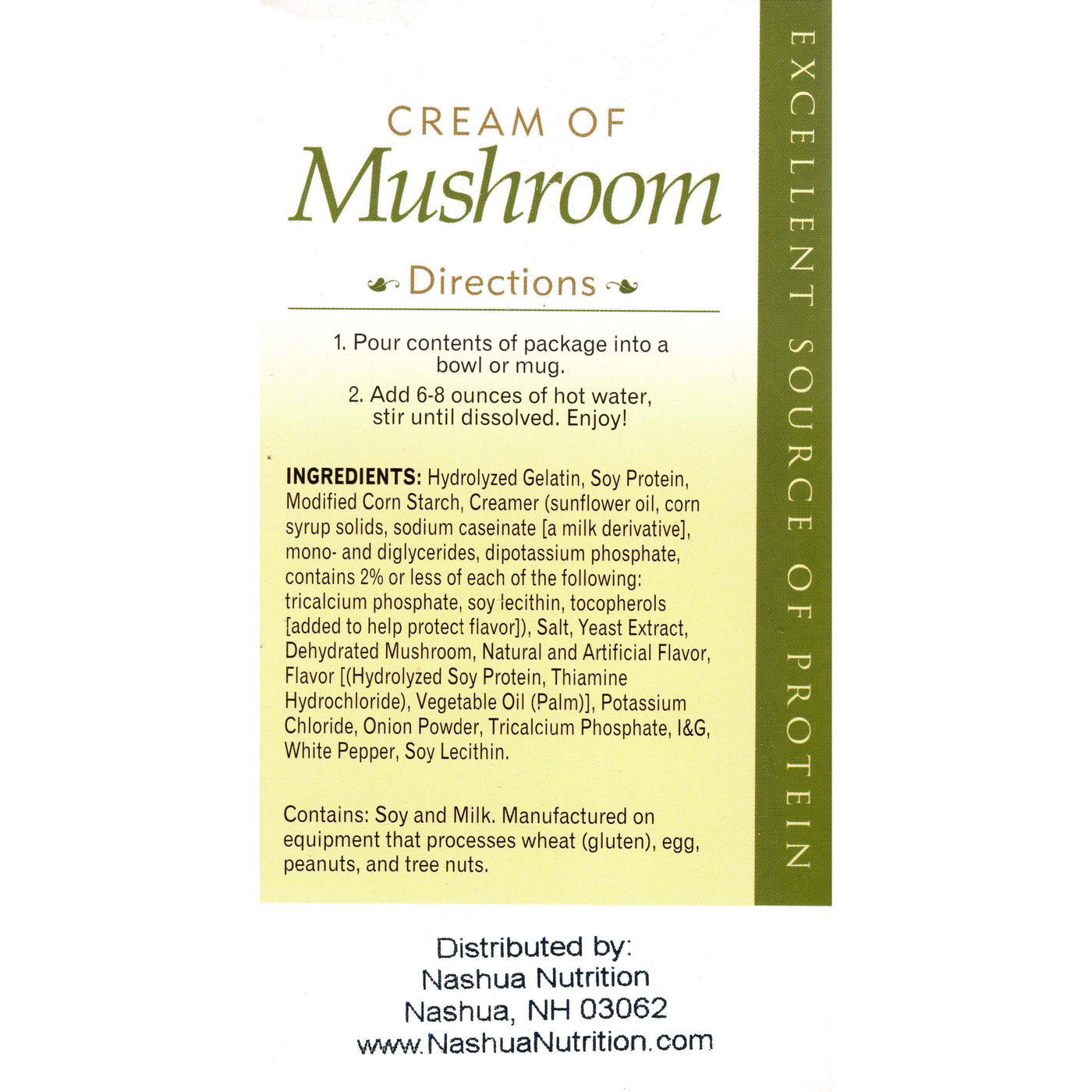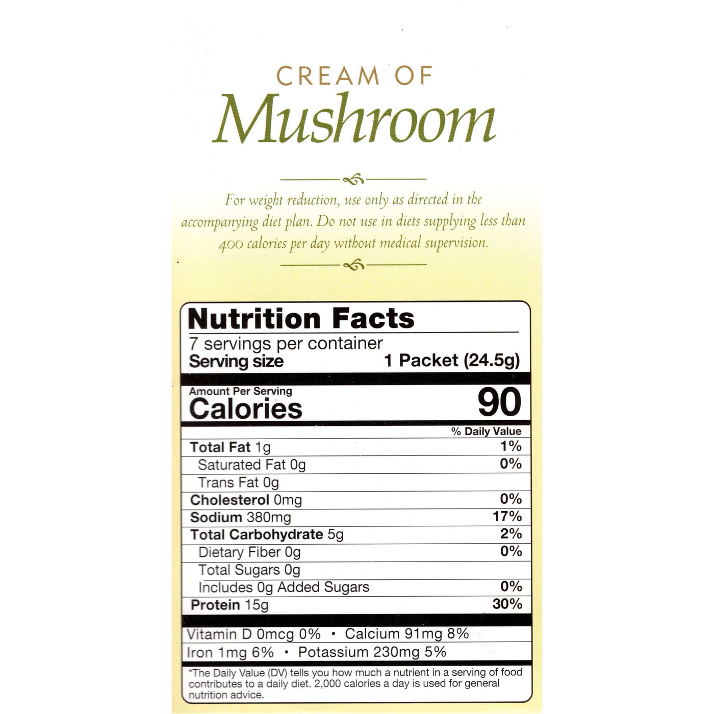 Enjoy the hearty and wonderfully creamy HealthSmart Cream of Mushroom Soup. This low-calorie, low-fat soup is the perfect solution when you are craving a delicious warm dinner or a cold-weather lunch. This protein-packed soup contains 15g of protein per serving, with each box containing 7 servings. This soup can also be used a healthy alternative in recipes that call for Mushroom soup.