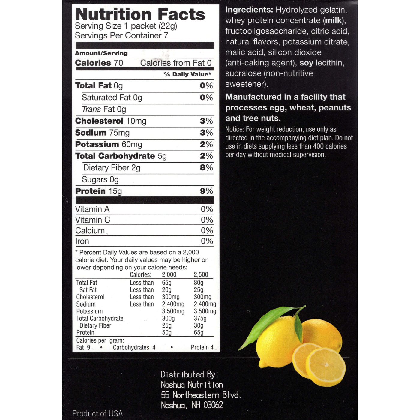 Hydrolyzed gelatin, whey protein concentrate (milk), fructooligosaccharide, citric acid, natural flavors, potassium citrate, malic acid, silicon dioxide (anti-caking agent), soy lecithin, sucralose (non-nutritive sweetener). Manufactured in a facility that processes egg, wheat, peanuts and tree nuts. |