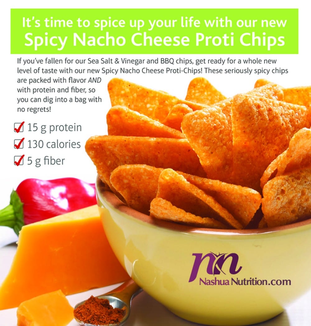 One crispy bite of our new Proti-Thin Spicy Nacho Proti Chips and you'll be hooked! These diet chips are every bit as tasty as deep fried and fatty alternatives, but these low-carb snack chips provide 15 grams of protein and 5 grams of fiber in every perfectly sized single-serving bag.