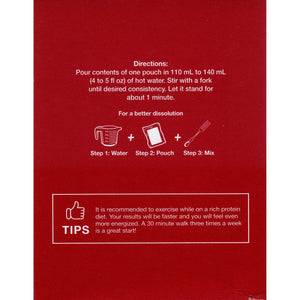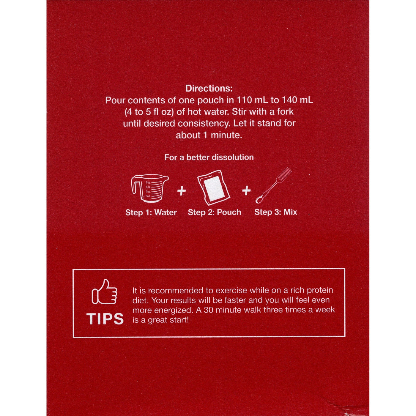 - Pour contents of one pouch in 110 to 140 ml (4 to 5 oz) of hot water. Stir with a fork until desired consistency.