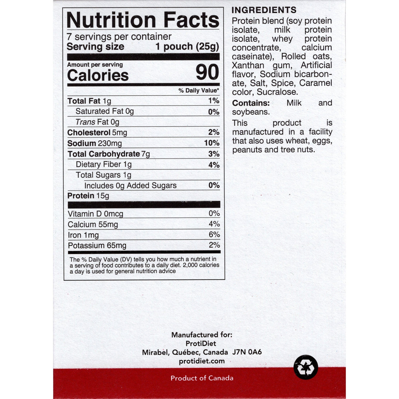 Protein blend (soy protein isolate, milk protein isolate, whey protein concentrate, calcium caseinate), rolled oats, xanthan gum, artificial flavor, sodium bicarbonate, salt, spice, caramel color, sucralose. |