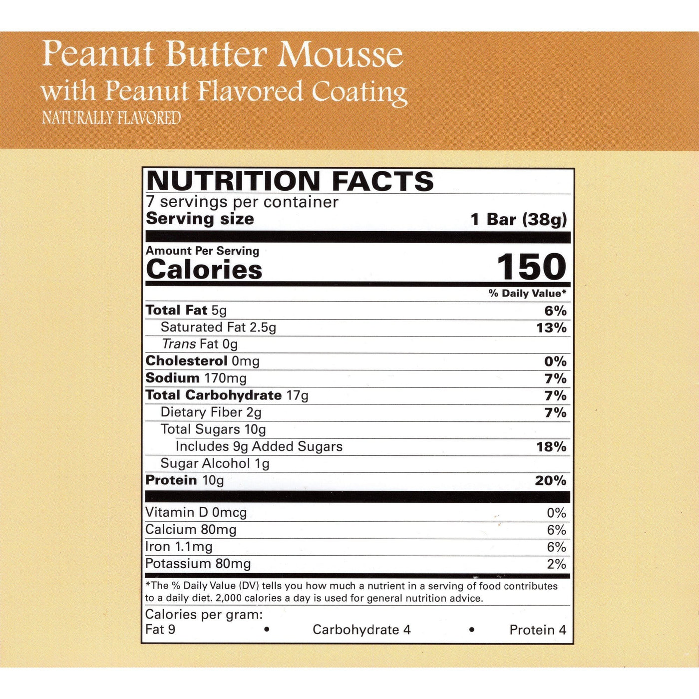 | Serving Size: 1 Bar (38g) | Servings Per Container: 7 | ||