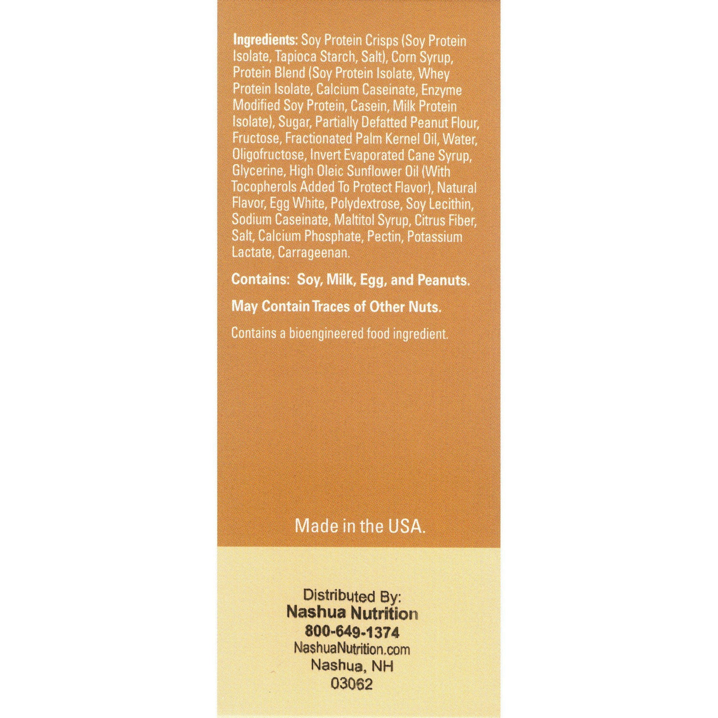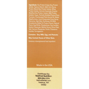 Soy Protein Crisps (Soy Protein Isolate, Tapioca Starch, Salt), Corn Syrup, Protein Blend (Soy Protein Isolate, Whey Protein Isolate, Calcium Caseinate, Enzyme Modified Soy Protein, Casein, Milk Protein Isolate), Sugar, Partially Defatted Peanut Flour, Fructose, Fractionated Palm Kernel Oil, Water, Oligofructose, Invert Evaporated Cane Syrup, Glycerine, High Oleic Sunflower Oil (With Tocopherols Added To Protect Flavor), Natural Flavor, Egg White, Polydextrose, Soy Lecithin, Sodium Caseinate, Maltitol Syrup, Citrus Fiber, Salt, Calcium Phosphate, Pectin, Potassium Lactate, Carrageenan. Contains: Soy, Milk, Egg and Peanuts. MAY CONTAIN TRACES OF OTHER NUTS. |