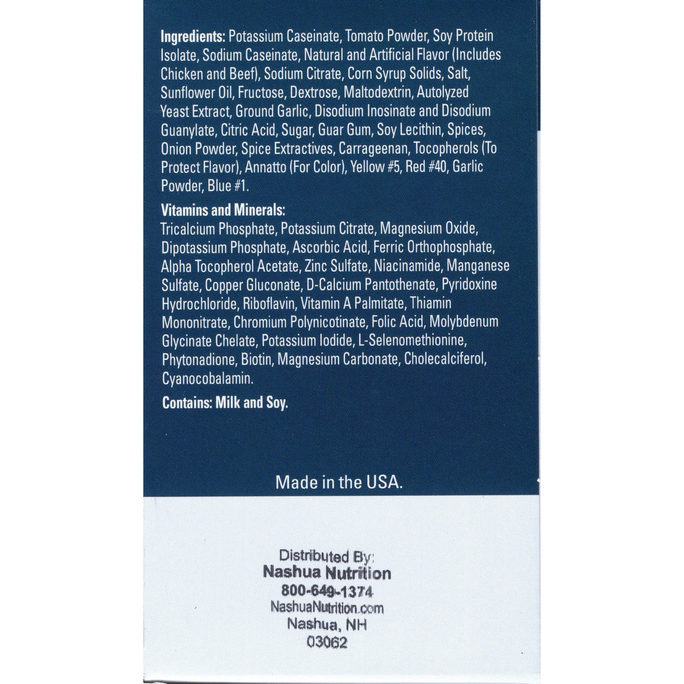 Potassium Caseinate, Tomato Powder, Soy Protein Isolate, Sodium Caseinate, Natural and Artificial Flavors (includes Chicken and Beef), Sodium Citrate, Corn Syrup Solids, Salt, Sunflower Oil, Fructose, Dextrose, Maltodextrin, Autolyzed Yeast Extract, Ground Garlic, Disodium Inosinate and Disodium Guanylate, Citric Acid, Sugar, Guar Gum, Soy Lecithin, Spices, Onion Powder, Spice Extractives, Carrageenan, Tocopherol (to protect flavor), Annatto (for color), Yellow #5, Red #40, Garlic Powder, Blue #1. Vitamins and Minerals: Contains: Milk and Soy |